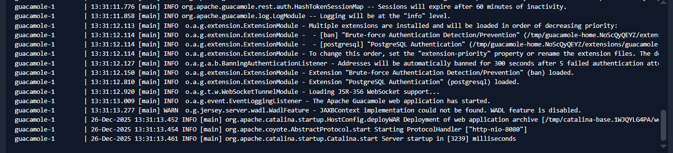 guacamole_compose | 26-Dec-2025 12:57:35.277 INFO [main] org.apache.catalina.startup.HostConfig.deployWAR Deployment of web application archive [/tmp/catalina-base.kh9tYDqvTz/webapps/guacamole.war] has finished in [36,416] ms