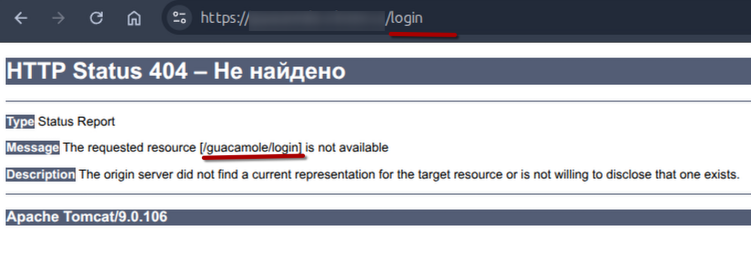 Сам сервис работает и открывается, данная ошибка возвращается веб-сервером, на основе которого построен контейнер guacamole