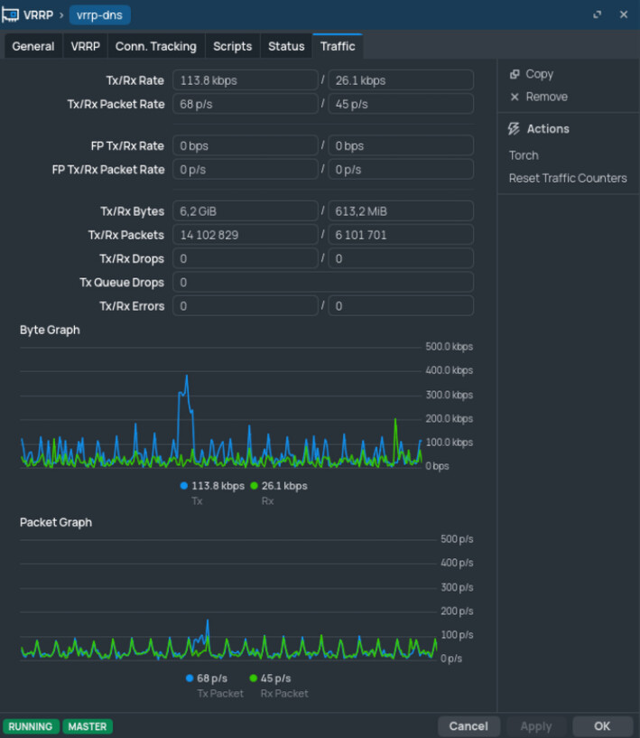 Вот трафик на DNS интерфейсе, с учетом того, что DNS UDP должен влезть в 1 пакет, то нижный график показывает количество DNS запросов в секунду (от 20 до 100) и 6.2 ГБ ответов за 1 день, 17 часов, 17 минут