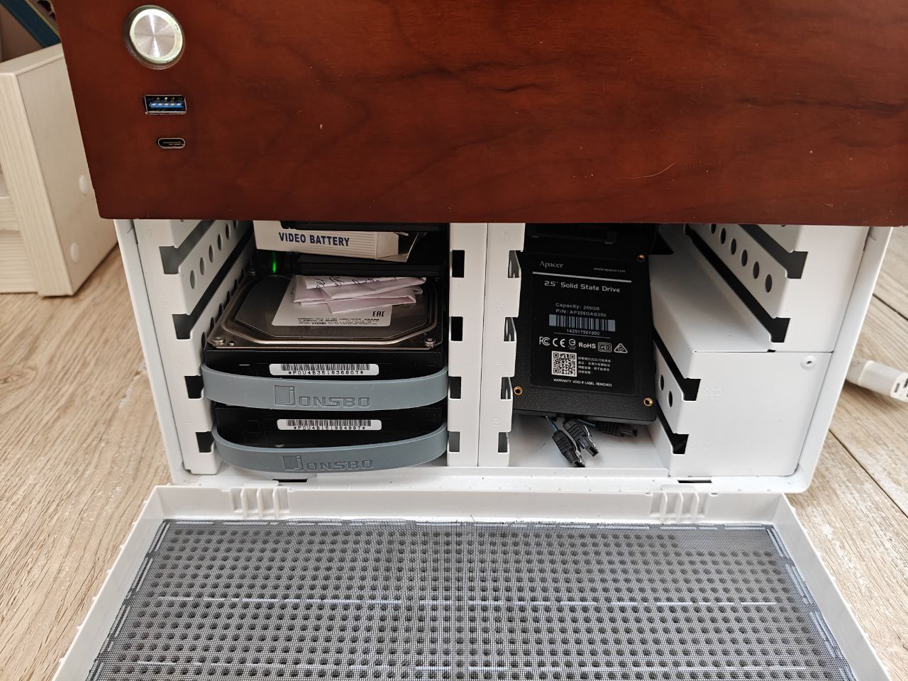 текущая хранилка это N3160 + 8 оперативки + 4 диска и 5й под систему. диски в зеркалах попарно. корпус неидеален, поэтому допкулек поставил. крутится на ней OMV.