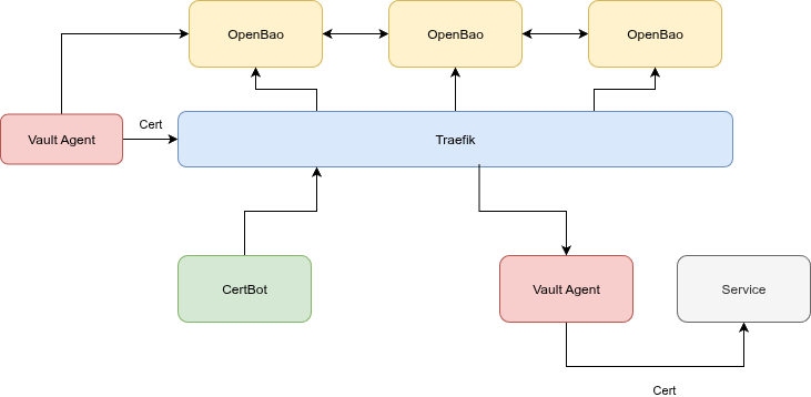 - Балансировка трафика частично реализована средствами traefik, например, consul и openbao в service указаны внутренние адреса всех нод, соостветственно, по адресу https://openbao.domain.com отвечает любая из доступных traefik нод (не любая, а одна из доступных в соответствии с приоритезацией), которая направляет запрос на любую из доступных нод