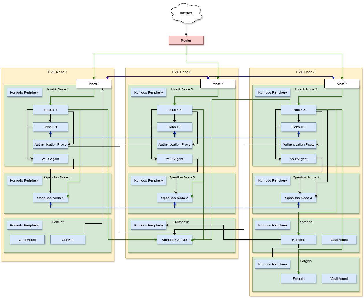 - Часть сервисов, таких, как komodo, certbot, forgejo, либо не отказоустойчивые, либо отказоустойчивость организована другими методами (например proxmox HA)