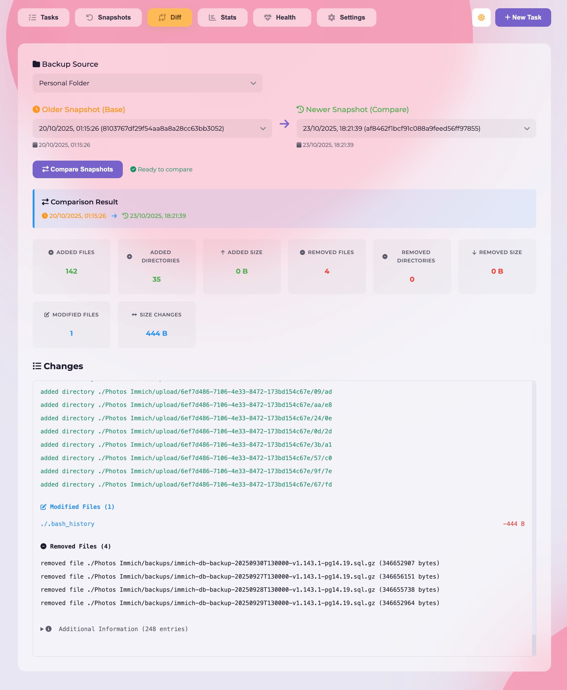 1.3 клиент vorta умеет сравнивать бэкапы между собой (прям показывает какие файлы поменялись, какие добавились в каждом бэкапе), можно монтировать бэкап - PBS по-умолчанию, читает все файлы и проверяет контрольные суммы, но это выдает большую нагрузку, я включил режим проверки метаданных, т.е. если файл не поменял размер или дату изменения, то он пропускается, работает очень быстро