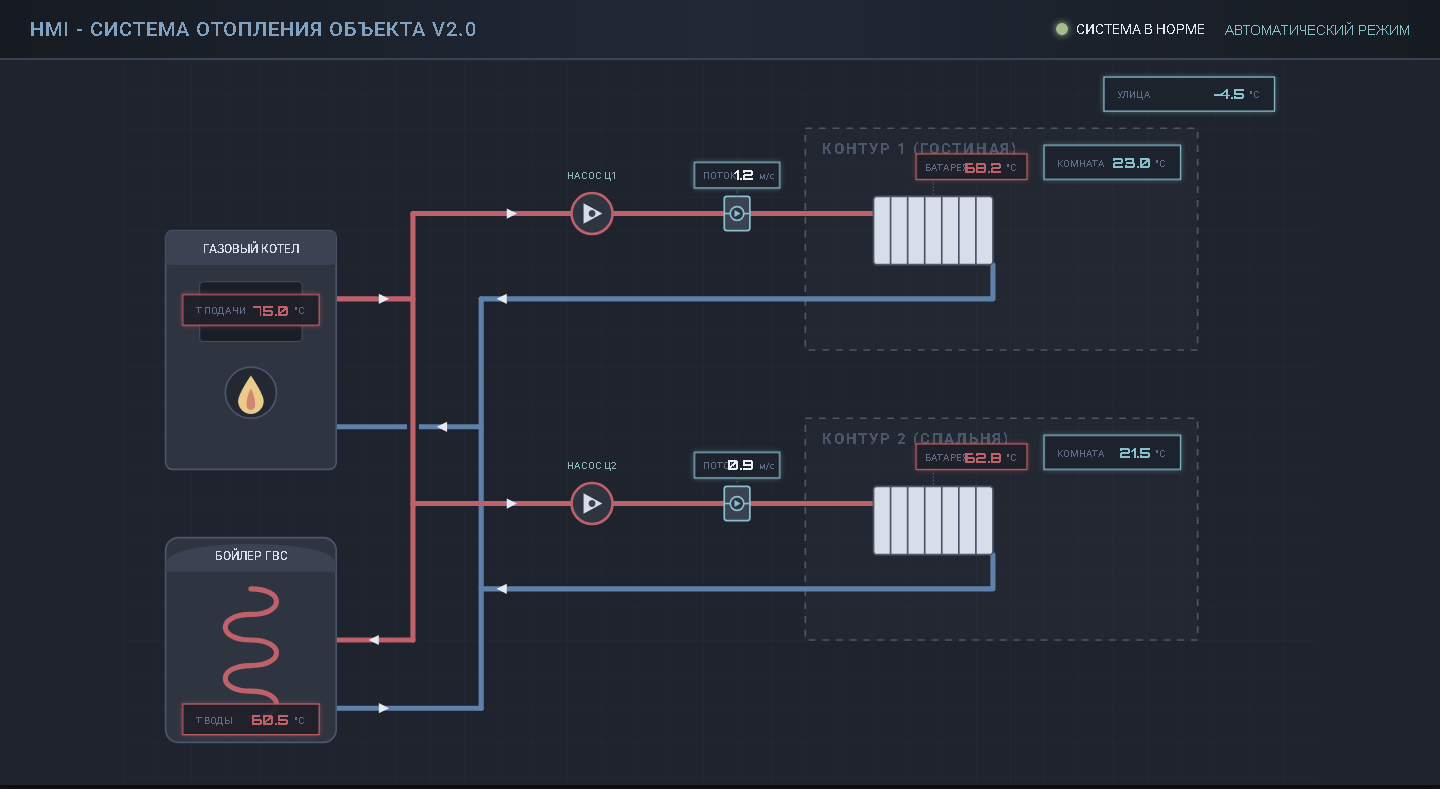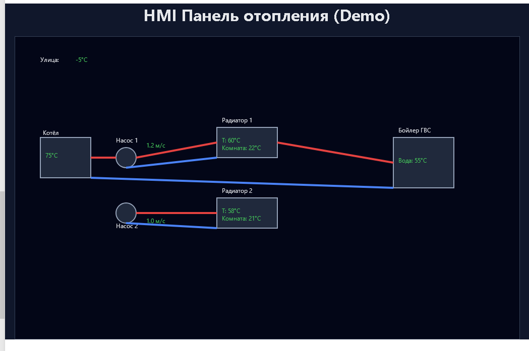 создай html + svg страницу проекта типа hmi panel как демо образец