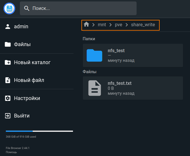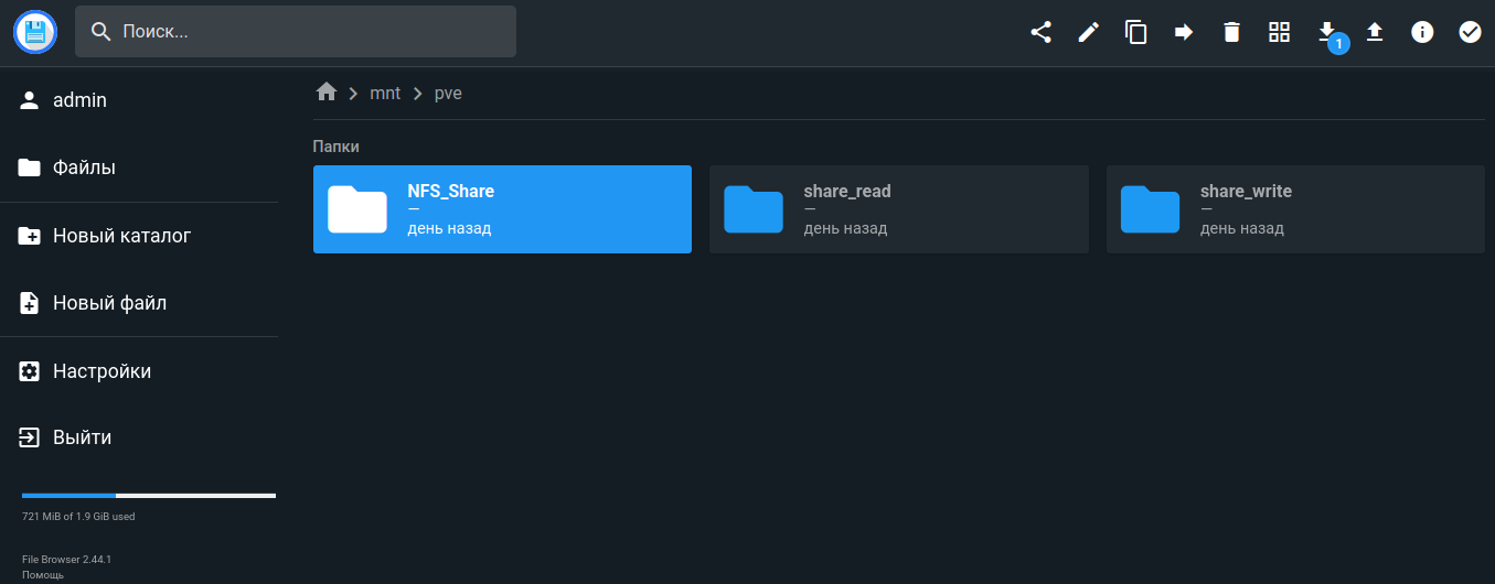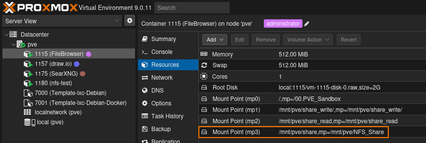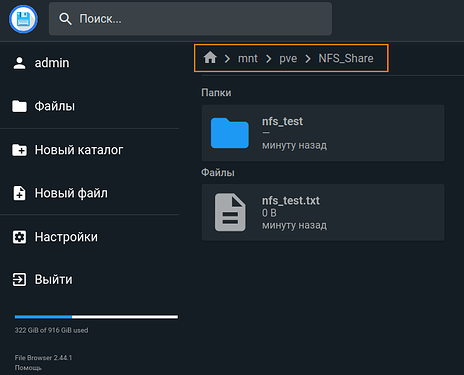 Для наглядности смонтировал nfs-директорию share в LXC контейнер с File Browser, где эта же директория (share_write) в рамках предыдущей статьи была смонитрована по протоколу samba.