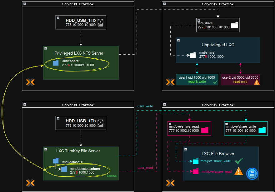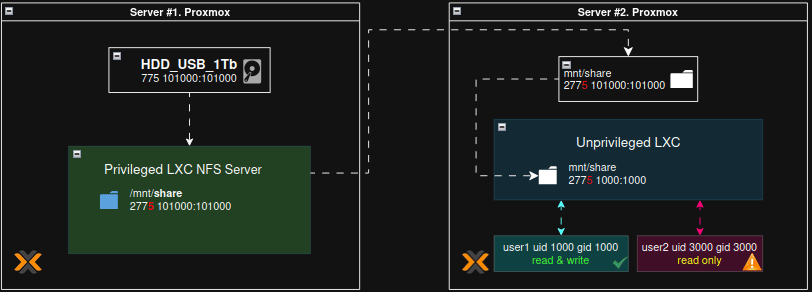 all_squash,anonuid,anongid(см. п.3.2 Настройка NFS-сервера в привилегированном LXC). Это поможет избежать проблем с разными uid и gid на клиентских машинах (дублирование, разный набор вторичных групп и т.д.) - Для дирекорий предназначенных только для чтения явно указывайте это в разрешениях на директорию и используйте параметр