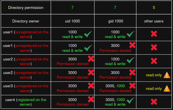 - Неизвестный NFS-серверу клиент получит разрешения на чтение и запись, соответствующие группе 101000(owner):