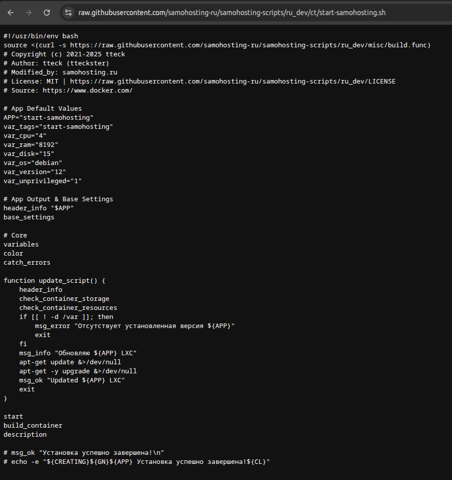 - Скачать свежий и актуальный образ Proxmox, установить его, а для запуска start-samohosting использовать команду ниже