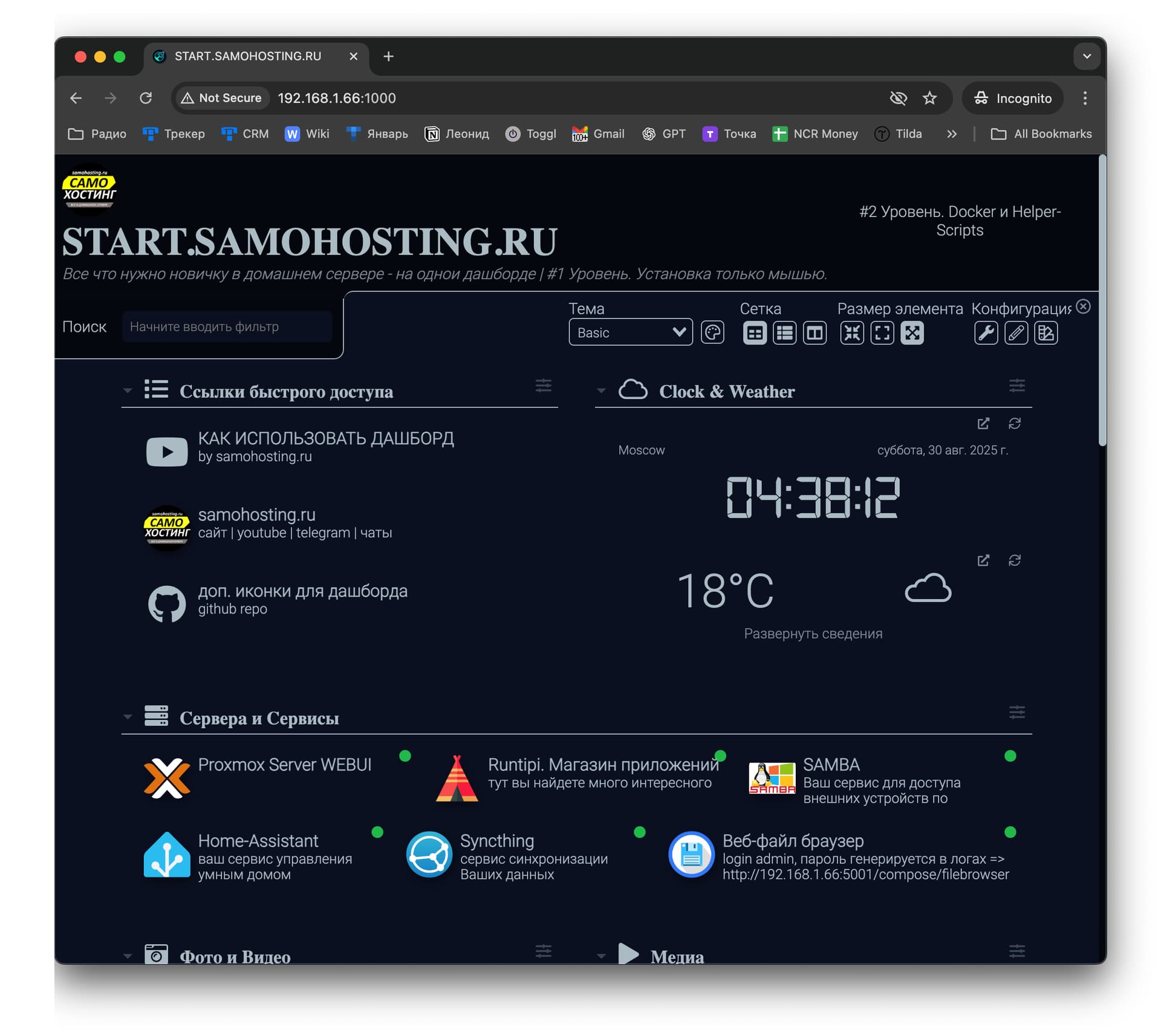 2. Вшита команда start-samohosting которая создаст LXC контейнер со всем необходимым для старта изучения домашнего сервера и его возможностей