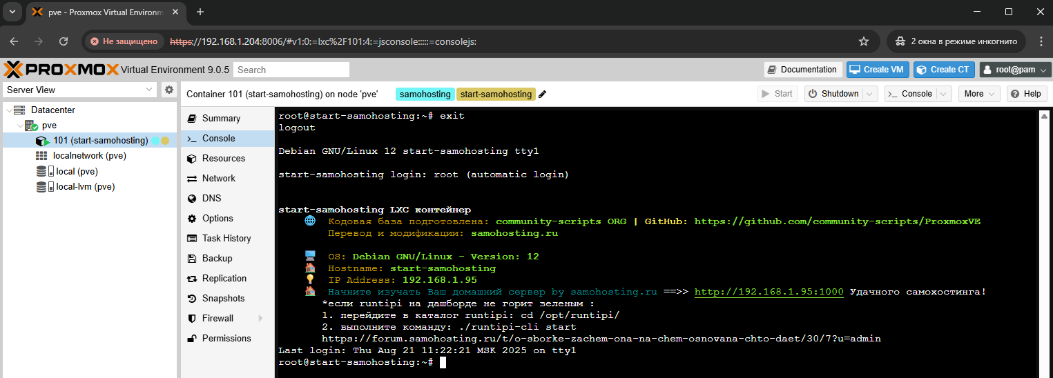 - Перейдите в консоль(pve-samohosting → shell)