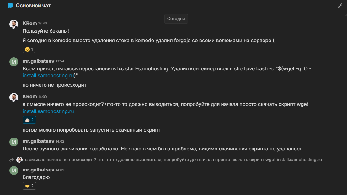 У меня при попытке перестановке ничего не происходит, удалил контейнер ввел в shell pve bash -c “$(wget -qLO - install.samohosting.ru)” но ничего не происходит