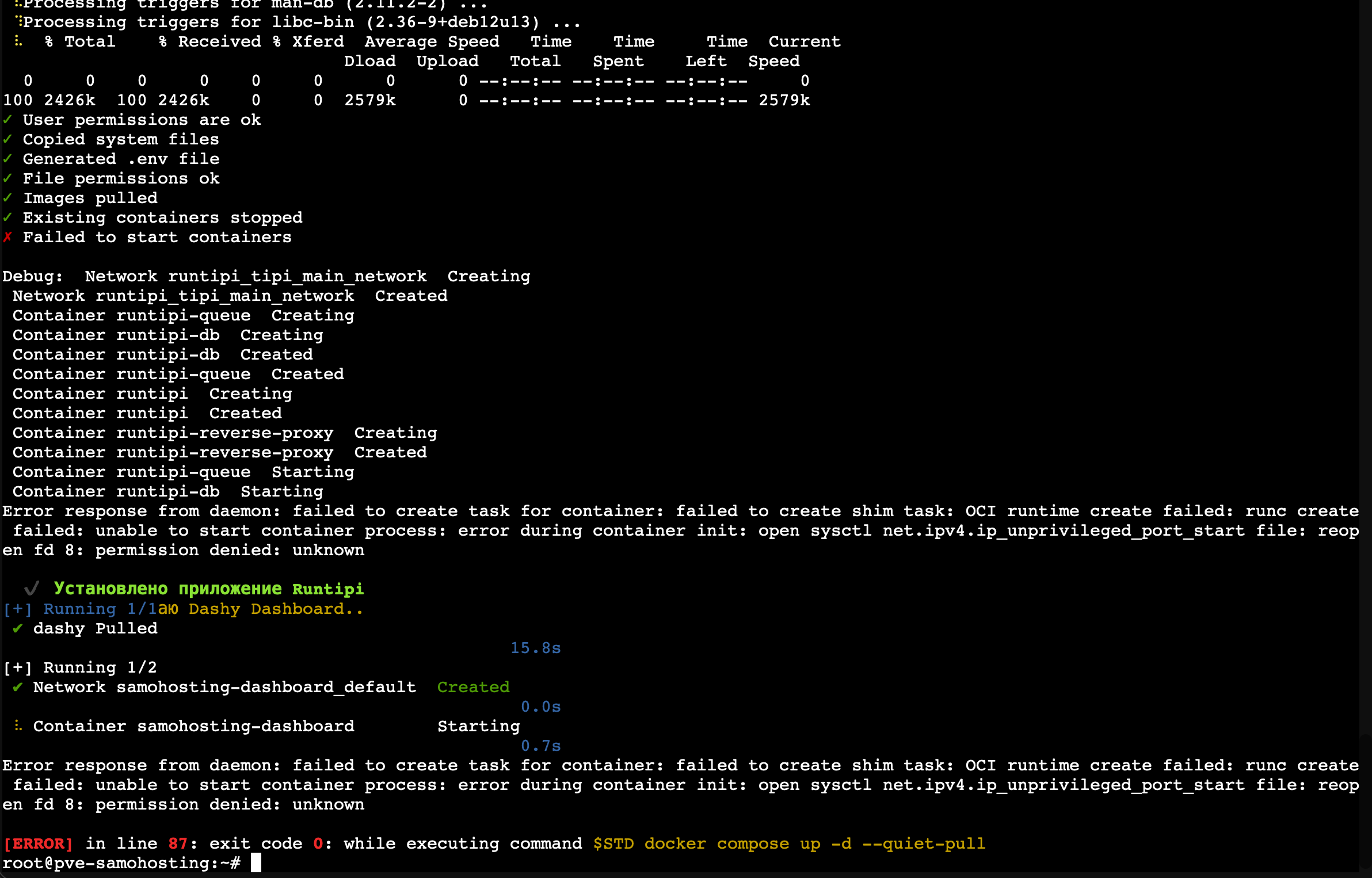 Запускаю командой start- samohosting. Процесс проходит нормально до установки runtipi. И вся установка заканчивается этой ошибкой. Пробовал устанавливать по умолчанию и с отладкой. Там только другая ошибка вылезает. Удалял. Снова ставил. Пока вот так. А если установить Linux mint 21.3 и потом установить runtipi?