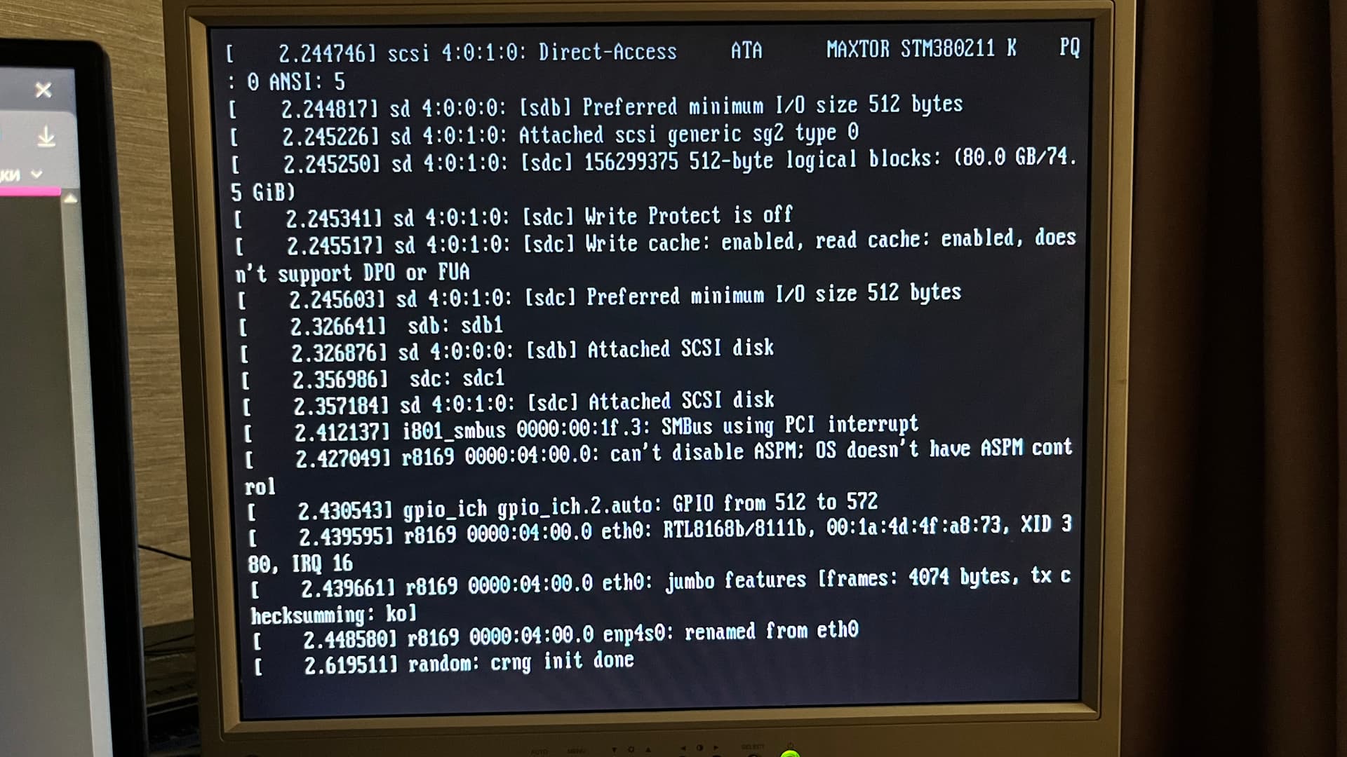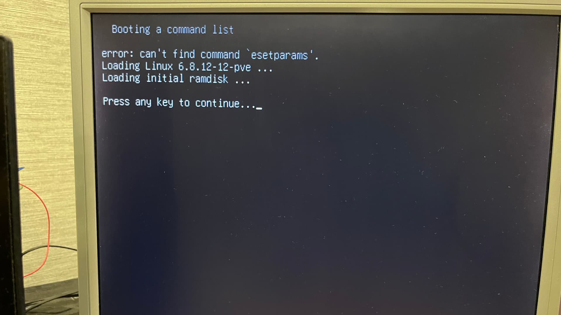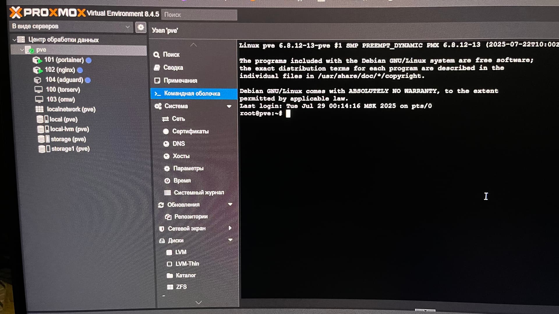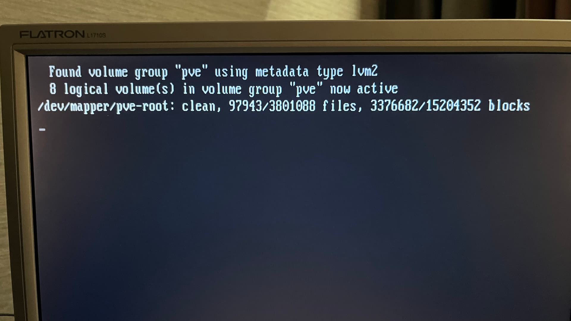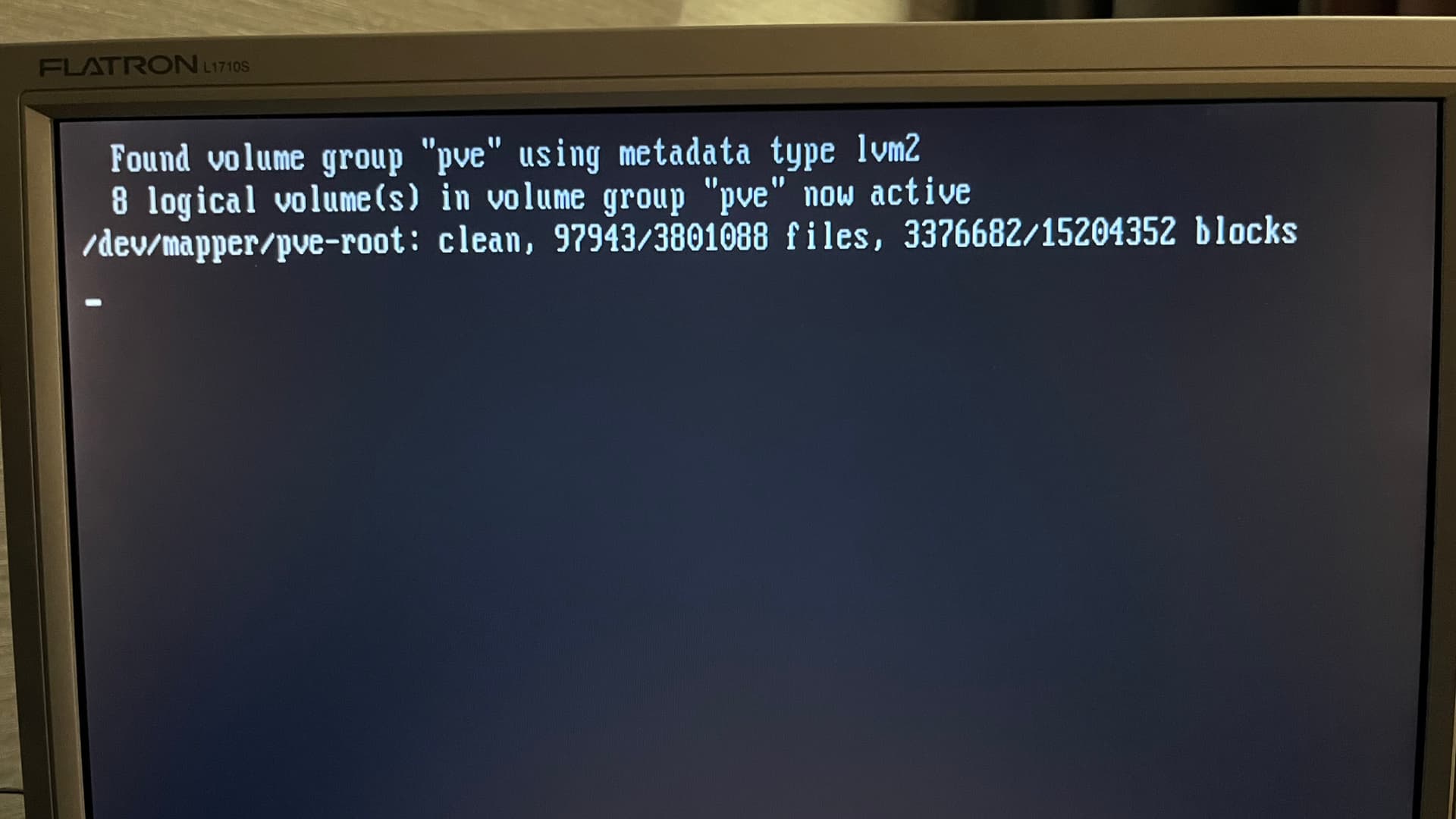 Суть проблемы после отключения автозапуска виртуальной машины с Openmediavaulet сетевое хранилище и перезагрузки Proxmox веб морда не доступна, другие сервисы не запускаются тоже. SSH так же не доступен ни к чему. Подключив монитор к Proxmox видео такую картинку