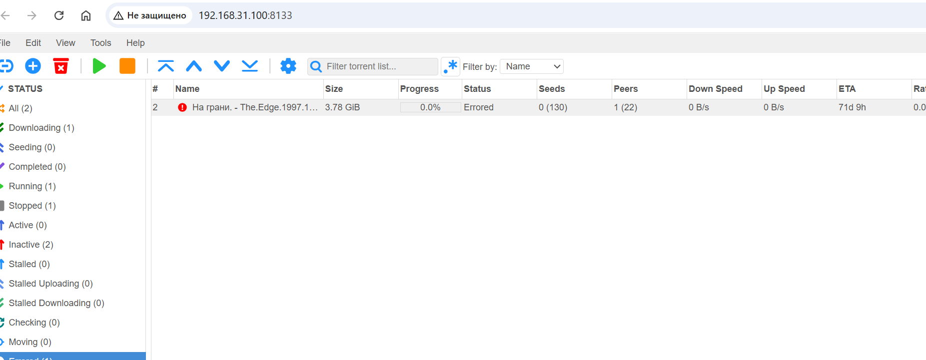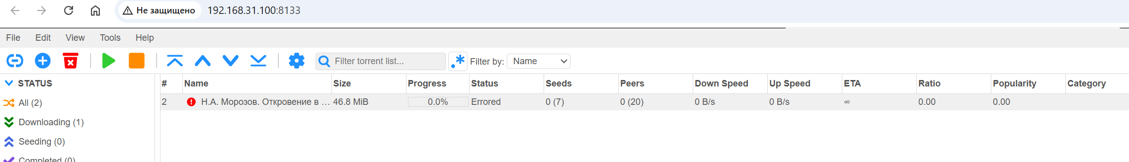 Тоже нет загрузки. Для торрента показывает статус Errored