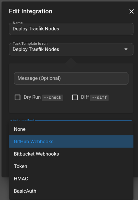 Для каждой интеграции указывается таска, тип аутентификаиции и кючи, как мы видим, можно подключить гитхабу и битбакету в качестве вебхука (при пуше в репозиторий будет выполняться)