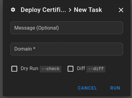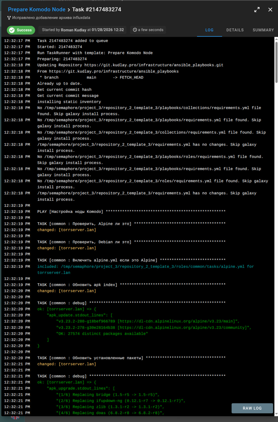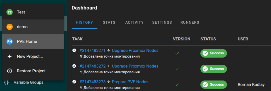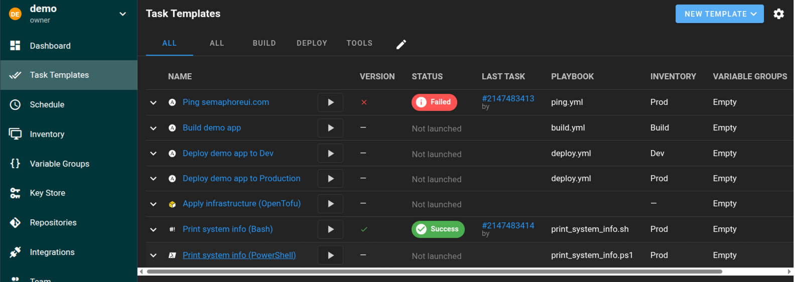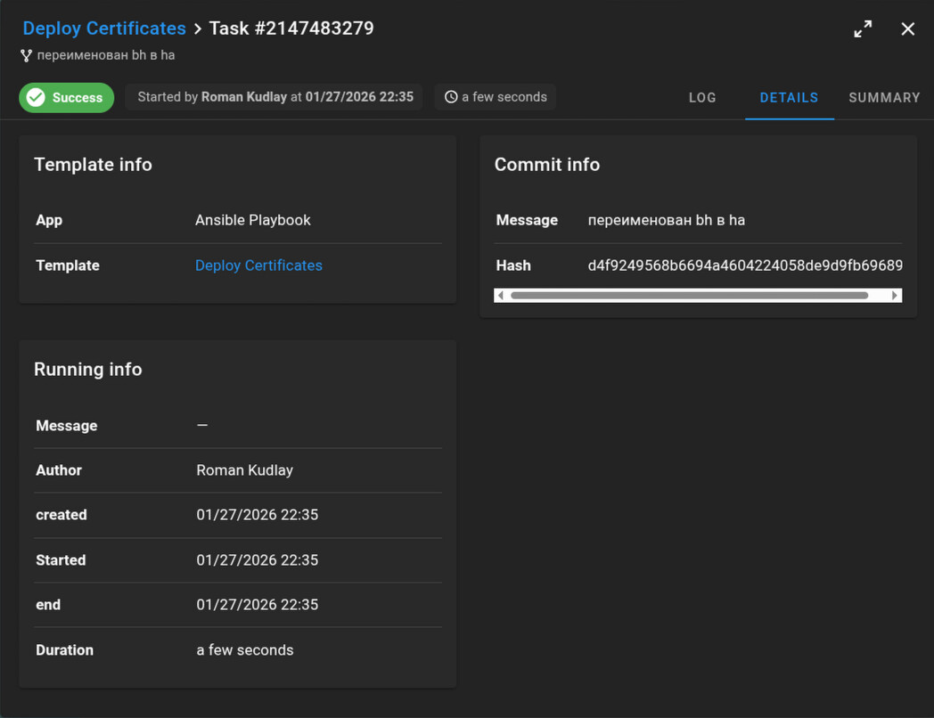 Мы тут видим все плейбуки, и прочие задачи, отображается статус последнего выполнения, задачи поделены на группы при помощи табов