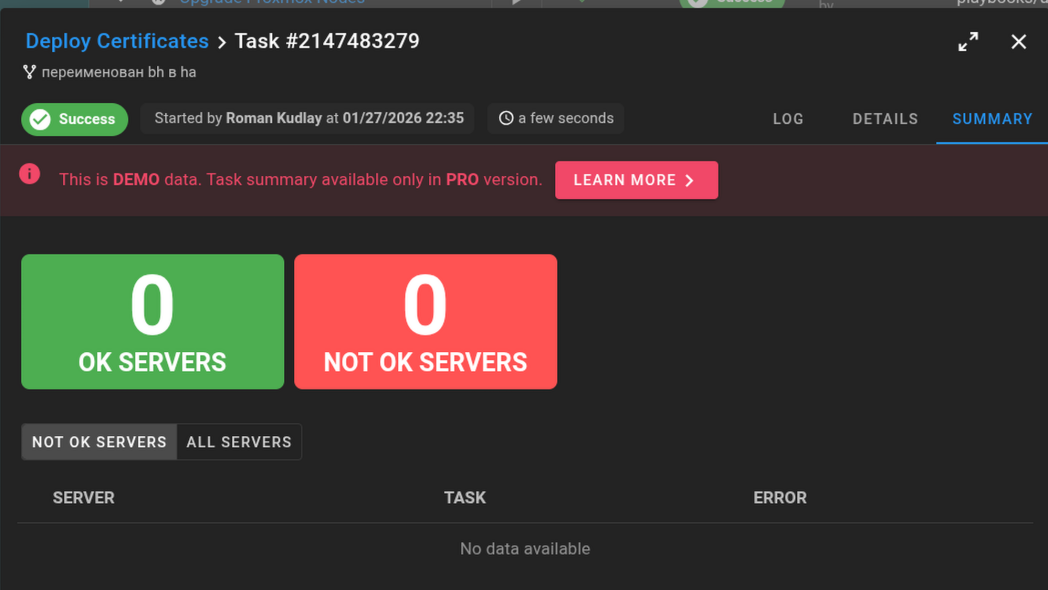 А вот тут нас встречает первый платный функционал, количество и список серверов, на которых выполнилось успешно или с ошибкой надо смотреть на 1 владке, а не тут