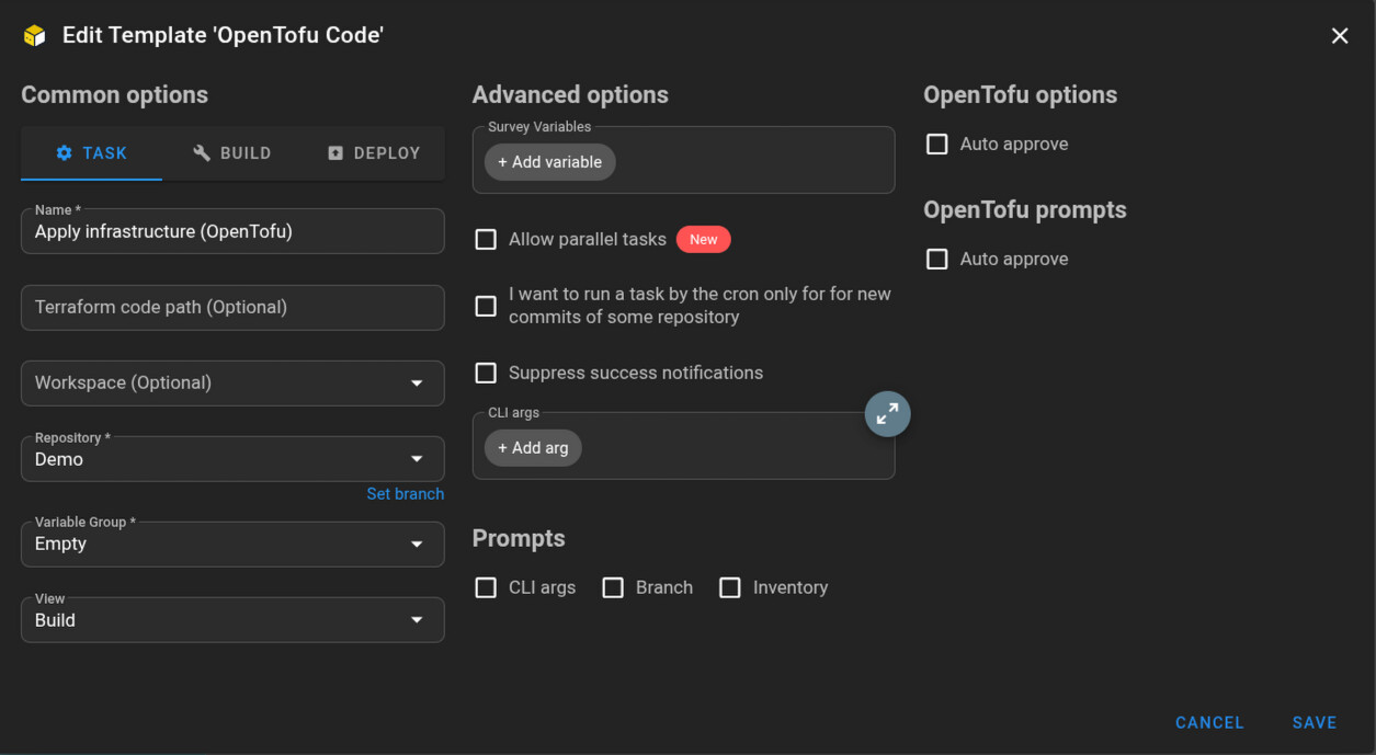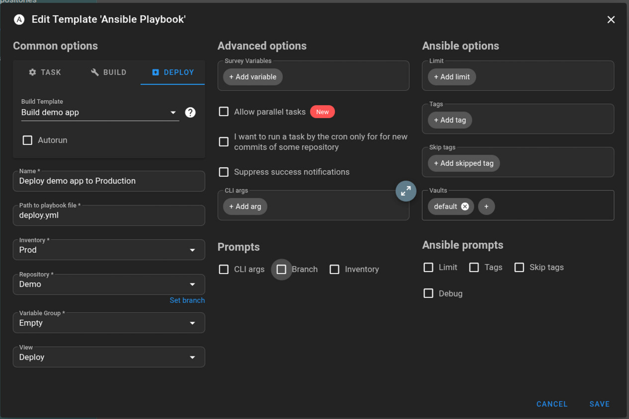 Тут мы указываем репозитрий с плейбуком, inventory, var group и собственно, сам путь к плейбуку