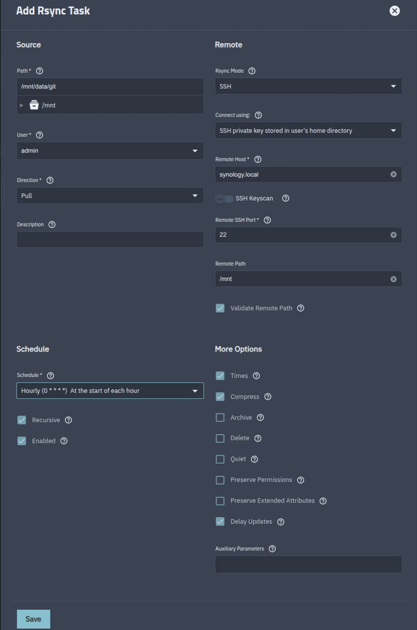 - 2 вариант требует установки rsync демона на Truenas в ввиде приложения (в core был в ядре), я пробовал его настроить, но не завелось с первой попытки и вообще очень кривое решение