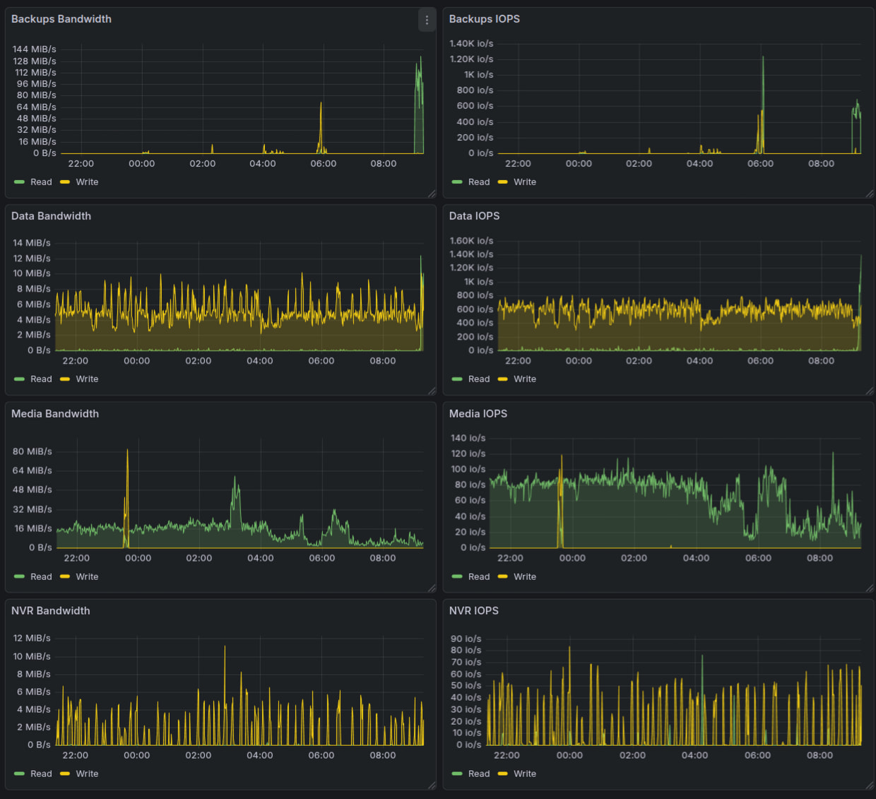 Графики по пулам, тут видно, что Media и NVR упираются в IOPS жесткого диска (порядка 80 для 5400), Data и Backups переваливают за 1000 IOPS