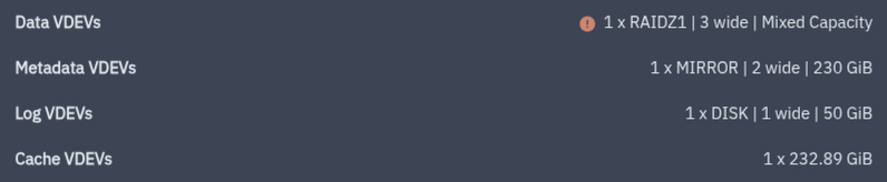 - Бэкапы - metadata + small blocks + slog для быстрого листинга файлов и чтения файлов с метаданными + slog для быстрого создания бэкапа, cache не стал добавлять т.к. он при чтение бэкапов тоже активное и кеш будет постоянно в режиме перезаписи