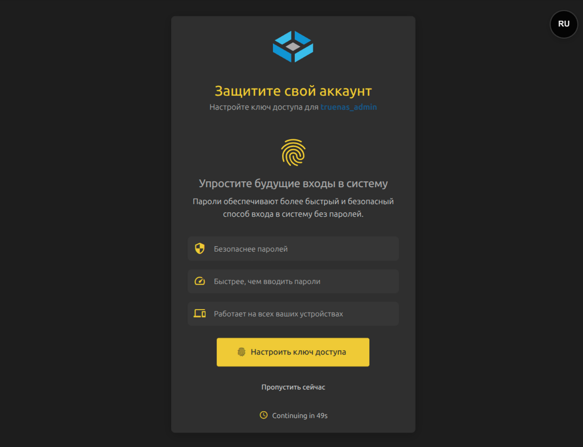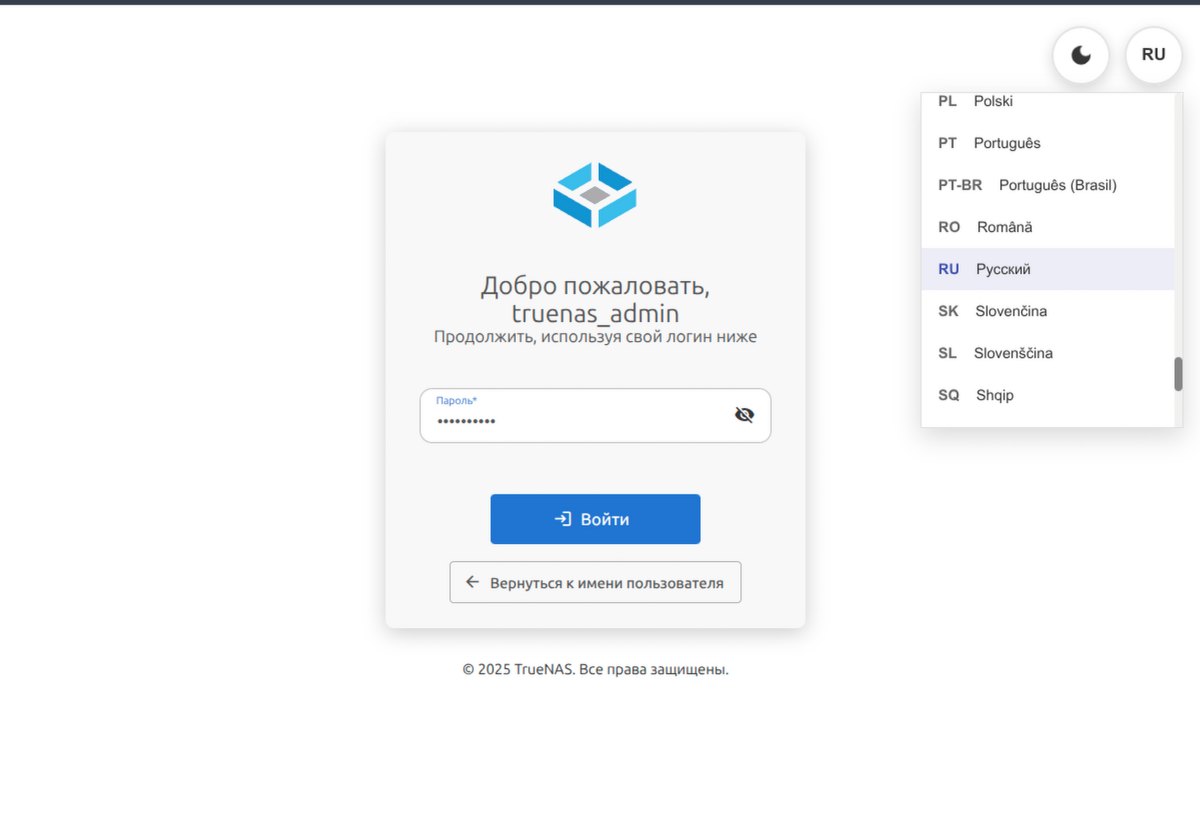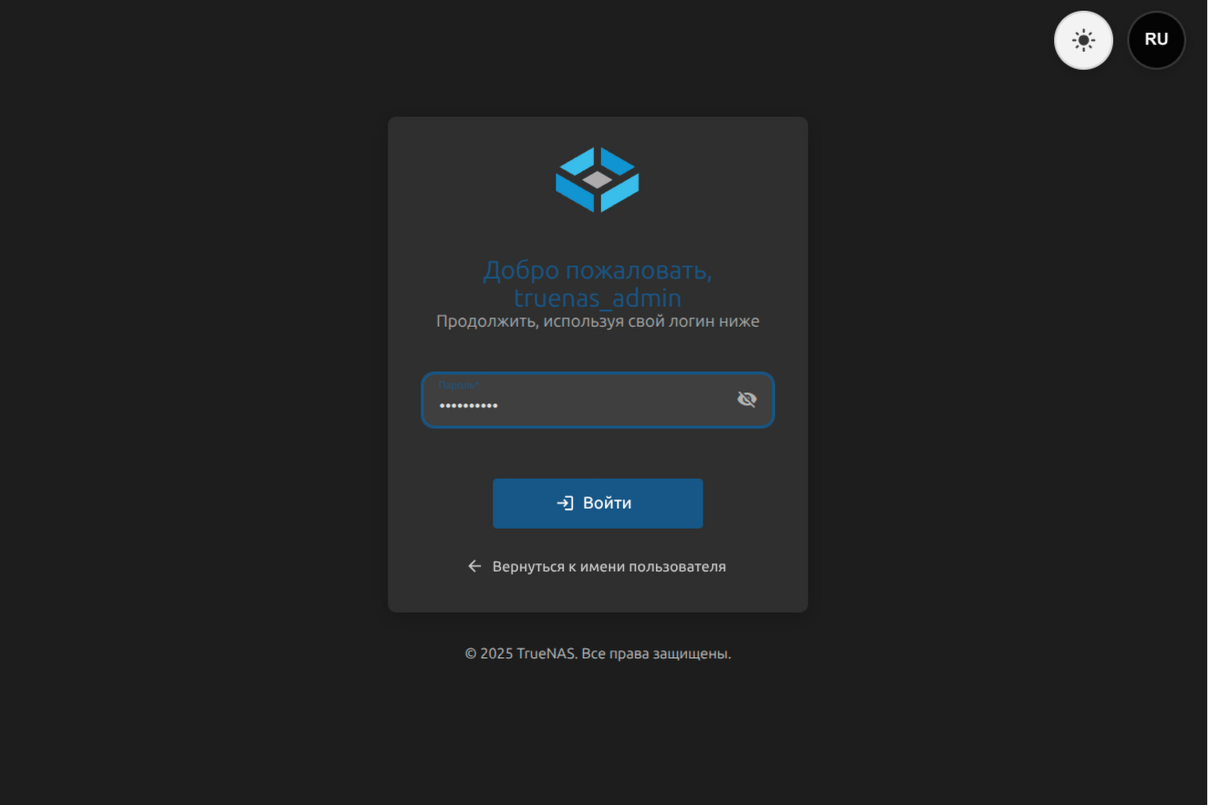 - Переходим по https://truenas_ip:755 (у меня активирован TrueConnect был и выдан сертификат, не знаю как там работает без него). Вводим имя пользоватея