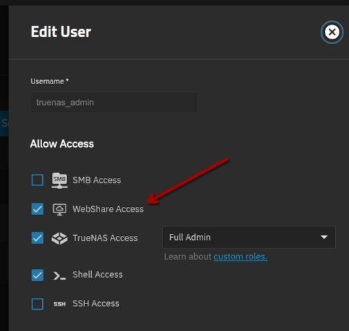 - Заходим в редактирование конкретного пользователя и включаем ему WebShare Access