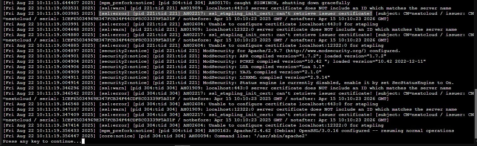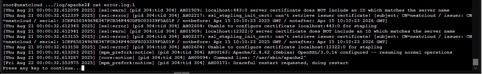 Доброго дня уважаемые форумчане. Вчера ночью, после нулей отвалилась админка, стартовая страница открывается нормально, после ввода учетки переходит на страницу “Internal Server Error. The server encountered an internal error and was unable to complete your request. Please contact the server administrator if this error reappears multiple times, please include the technical details below in your report. More details can be found in the server log.”. Ни делал ничего. Prox 9, переехал на него больше недели назад точно. Версия nextcloud актуальная, обновился не так давно, все работало корректно. Приложение на телефоне работает нормально. Покапал инет на этот предмет, ничего вразумительного не нашел. Сертификаты все на месте и действительны. В логах ошибки: