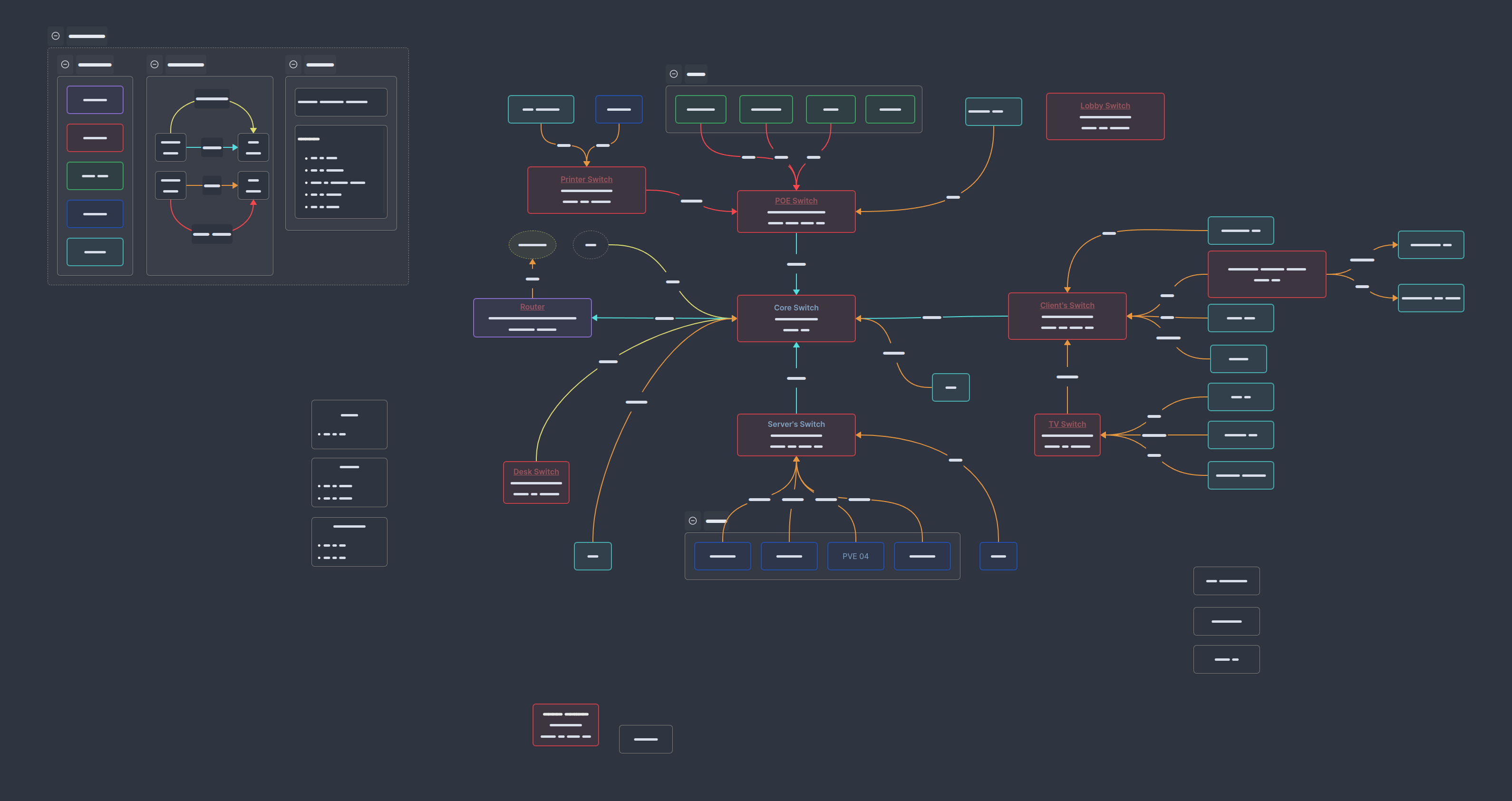 У меня получилось примерно так (фиолетовый роутер, красные свитчи, синие и бирюзовые (хо какой цвет) конечное оборудование, зеленые точки доступа)